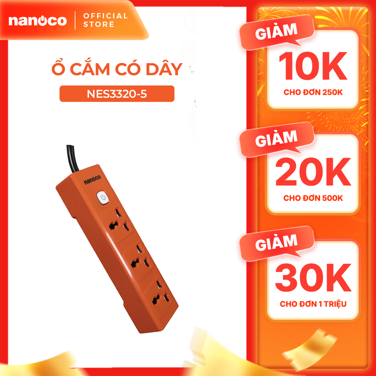 - Ổ Cắm Có Dây Nanoco NES3320-5 3 lỗ 3 chấu kích thước nhỏ gọn phù hợp để ở nhiều vị trí trong nhà.