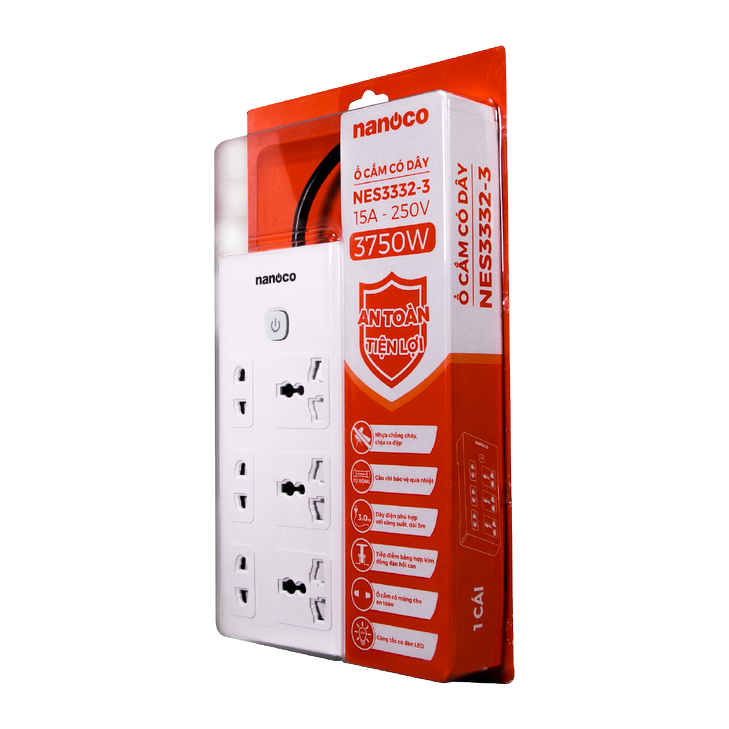 - Ổ Cắm Có Dây Nanoco NES3332-3, 3 ổ 2 chấu và 3 ổ đa năng kích thước nhỏ gọn phù hợp để ở nhiều vị trí trong nhà.