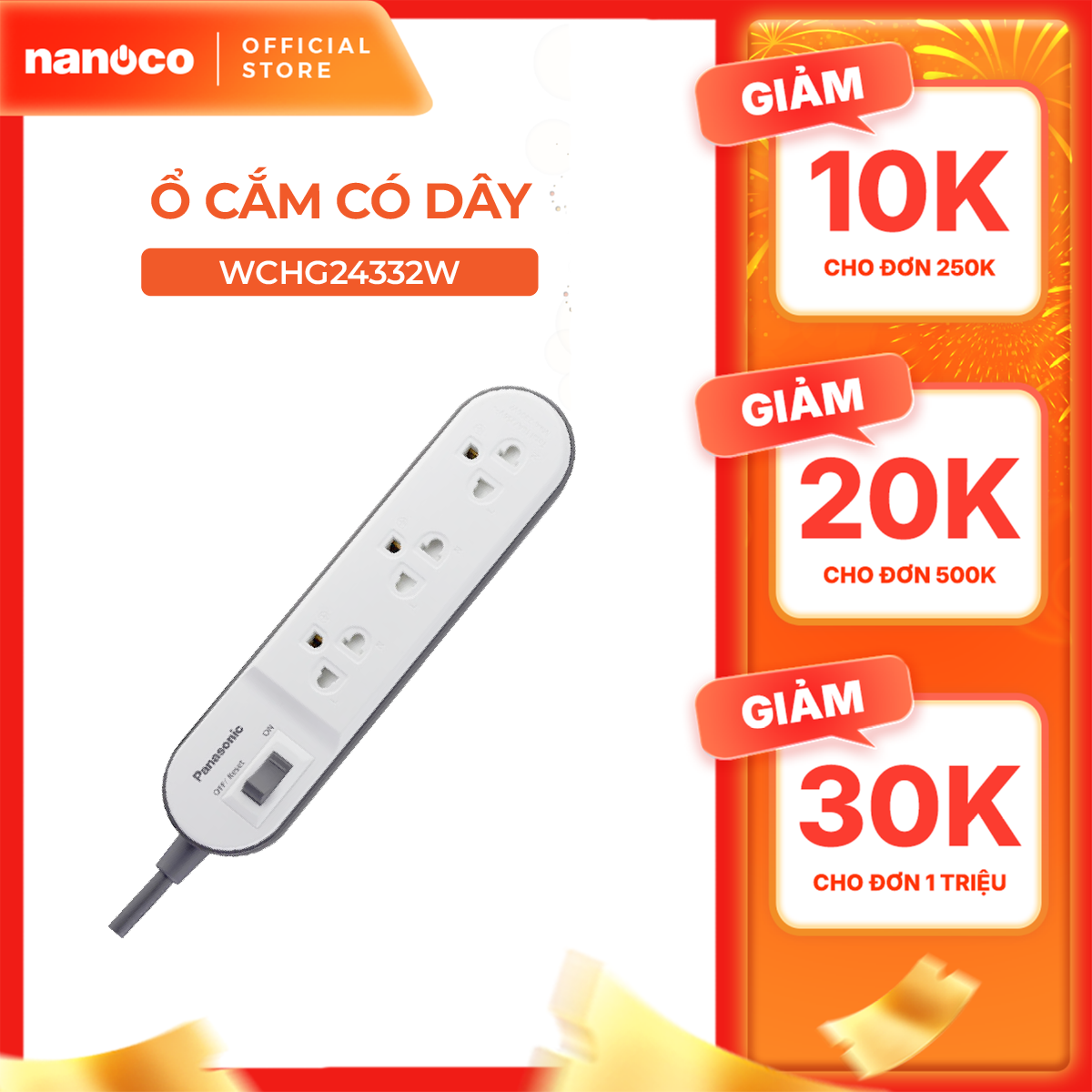 Ổ cắm Panasonic model WCHG24332W (công suất 2500W - dây 3m - 3 ổ cắm - 1 công tắc)