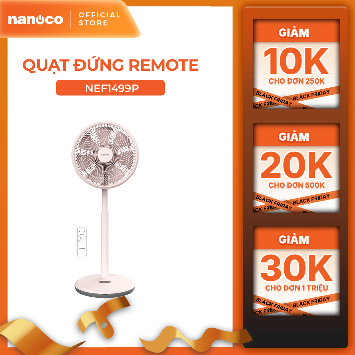 Quạt đứng động cơ BLDC có remote 14inch, 7 cánh, màu hồng/trắng Nanoco model NEF1499