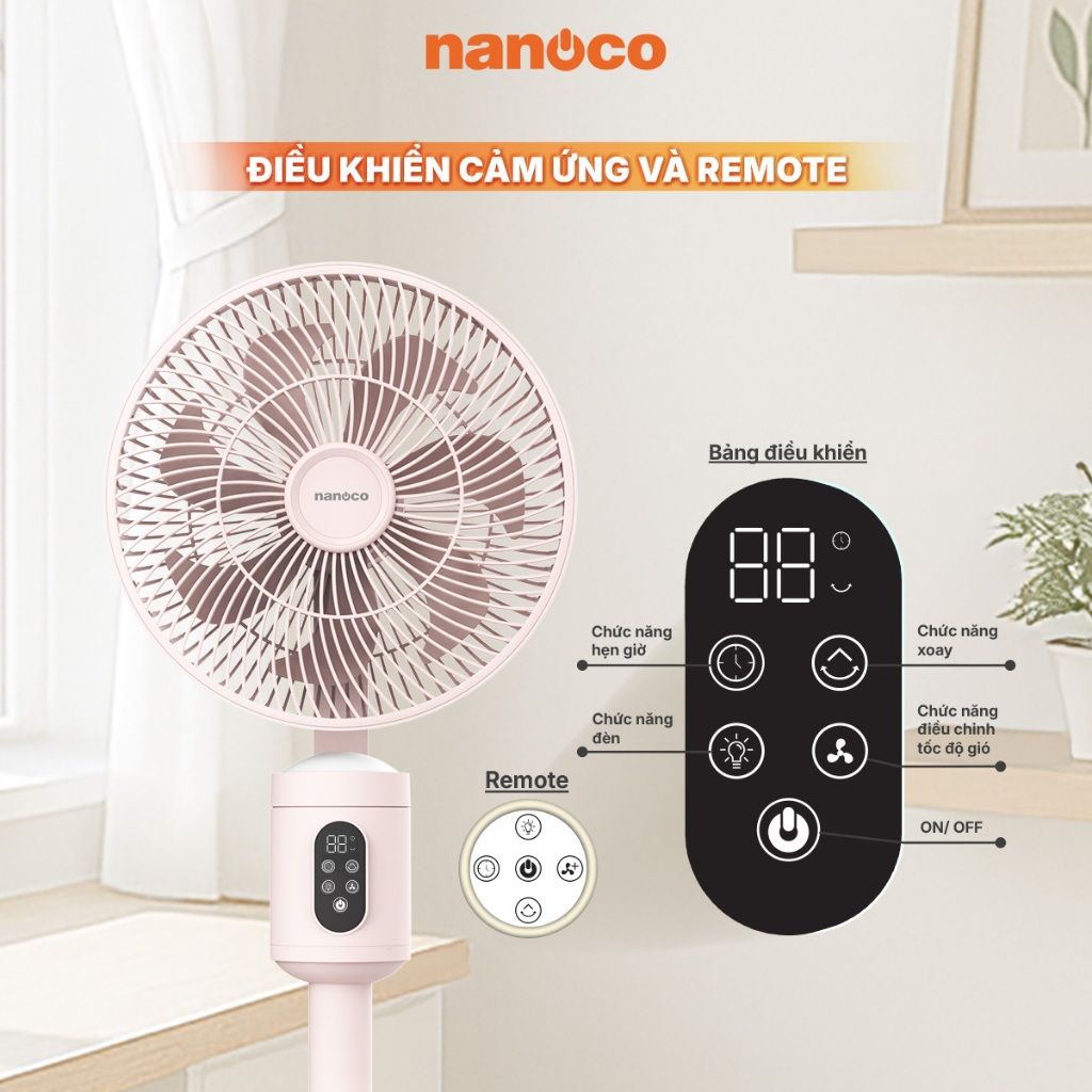 Quạt sạc cảm ứng có remote 9inch màu hồng Nanoco model NRF9025 màu hồng/trắng, pin Lithium 10.000mAh