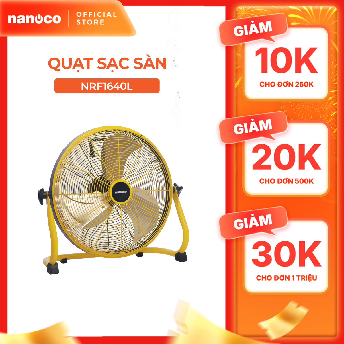 Quạt sạc sàn Nanoco model NRF1640L màu vàng (Công suất 29W, 16 inch)