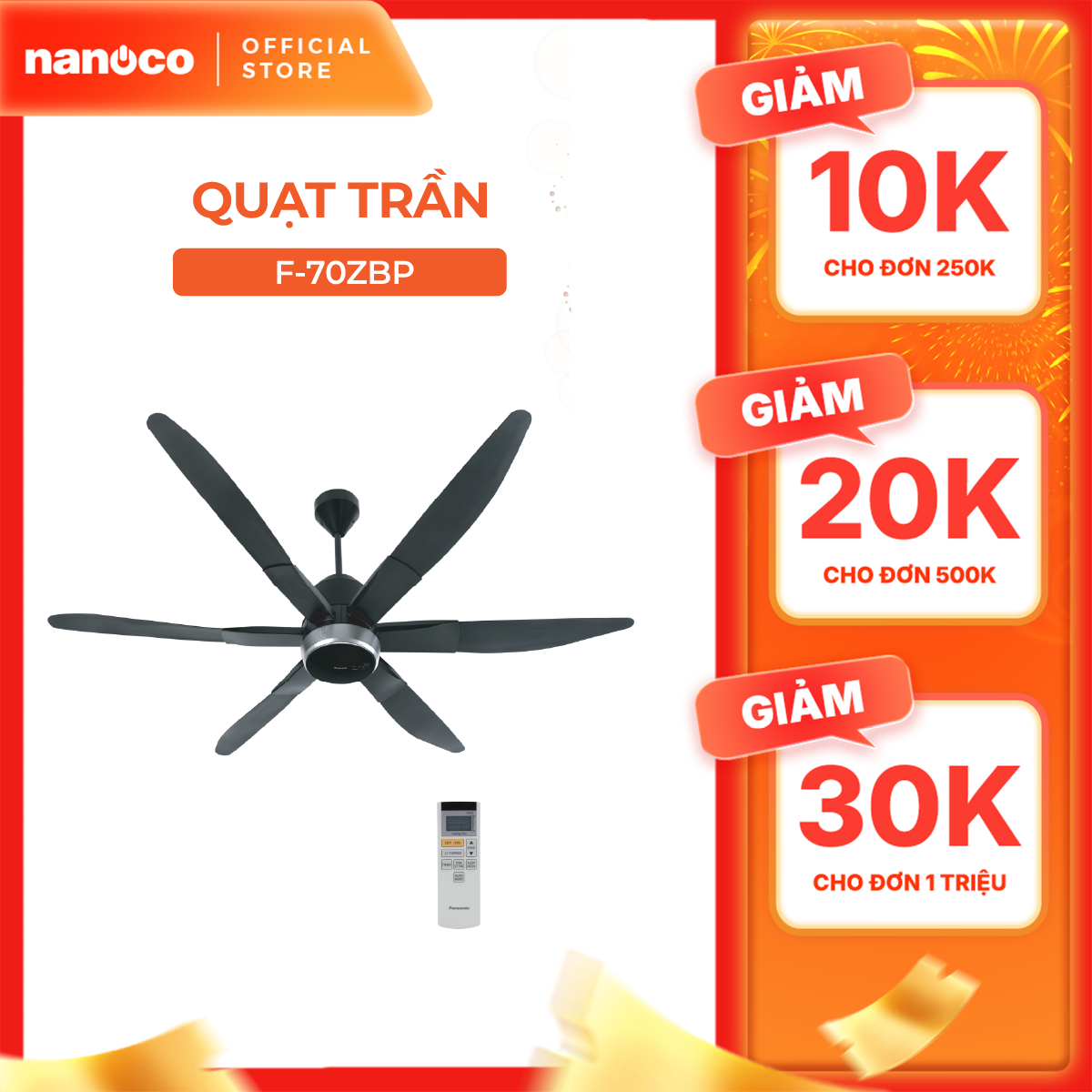 Quạt trần Panasonic model F-70ZBP (màu đen - 9 chế độ gió - công suất 51W) - KHÔNG GỒM PHÍ LẮP ĐẶT